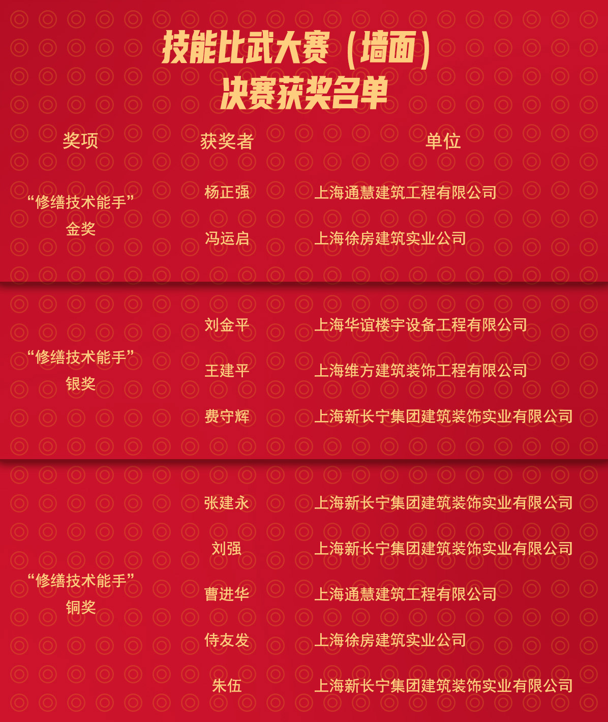 最終比賽獲獎(jiǎng)名單出爐,上海維方建筑裝飾工程有限公司斬獲“修繕技術(shù)能手” 銀獎(jiǎng)(個(gè)人)和班組項(xiàng)目一等獎(jiǎng)、三等獎(jiǎng)共計(jì)三個(gè)獎(jiǎng)項(xiàng)。